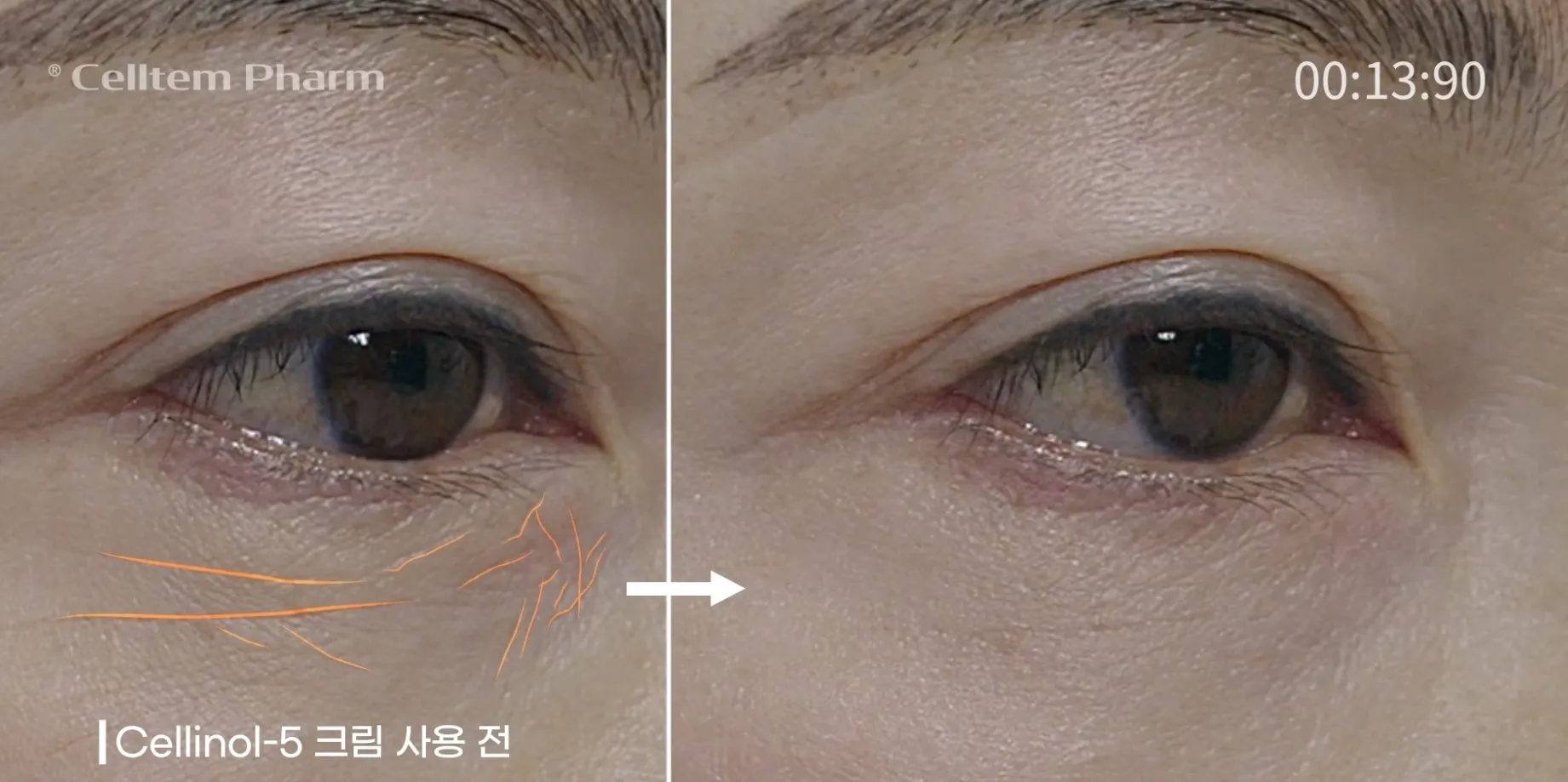 Chưa đầy 1 phút, vùng da dưới mắt đã có sự thay đổi. Các nếp nhăn mờ dần, mắt thường cũng có thể thấy được. Khi kiểm tra bằng máy soi da, các nếp nhăn giảm đáng kể, cho thấy khả năng vi diệu của kem Cellinol-5 trong việc là phẳng nếp nhăn và hồi sinh làn da lão hóa.
