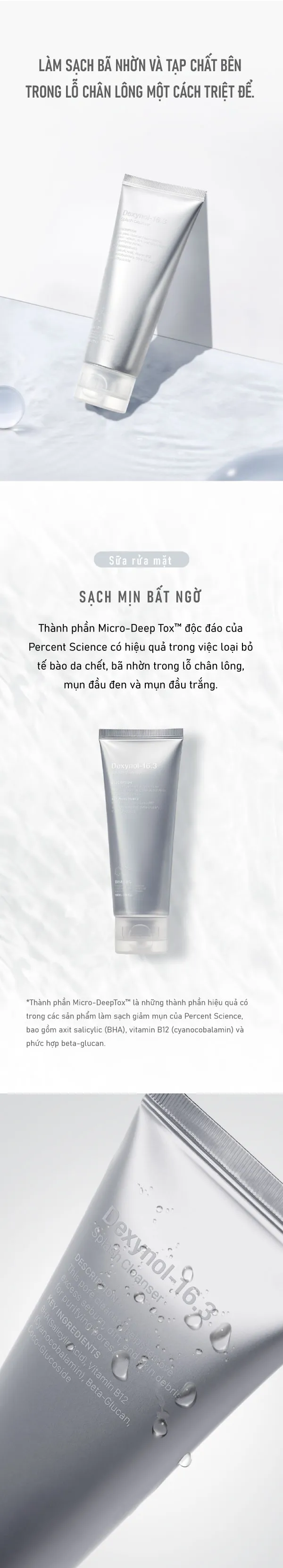 Sạch mịn bất ngờ làm sạch bụi bẩn và bã nhờn tích tụ dư thừa trong lỗ chân lông một cách triệt để. Thành phần Micro- Deep Tox TM độc đáo của Precent Science đặc biệt hiệu quả trong việc loại bỏ mụn đầu đen, mụn đầu trắng